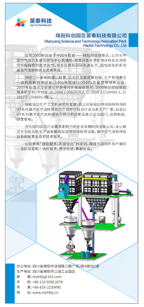 隨著鈦白生產(chǎn)工藝的研究與發(fā)展,我公司研制出中間粉碎所用的HT系列扁平式汽流粉碎機(jī)已廣泛用于鈦白行業(yè)眾多生產(chǎn)廠家。